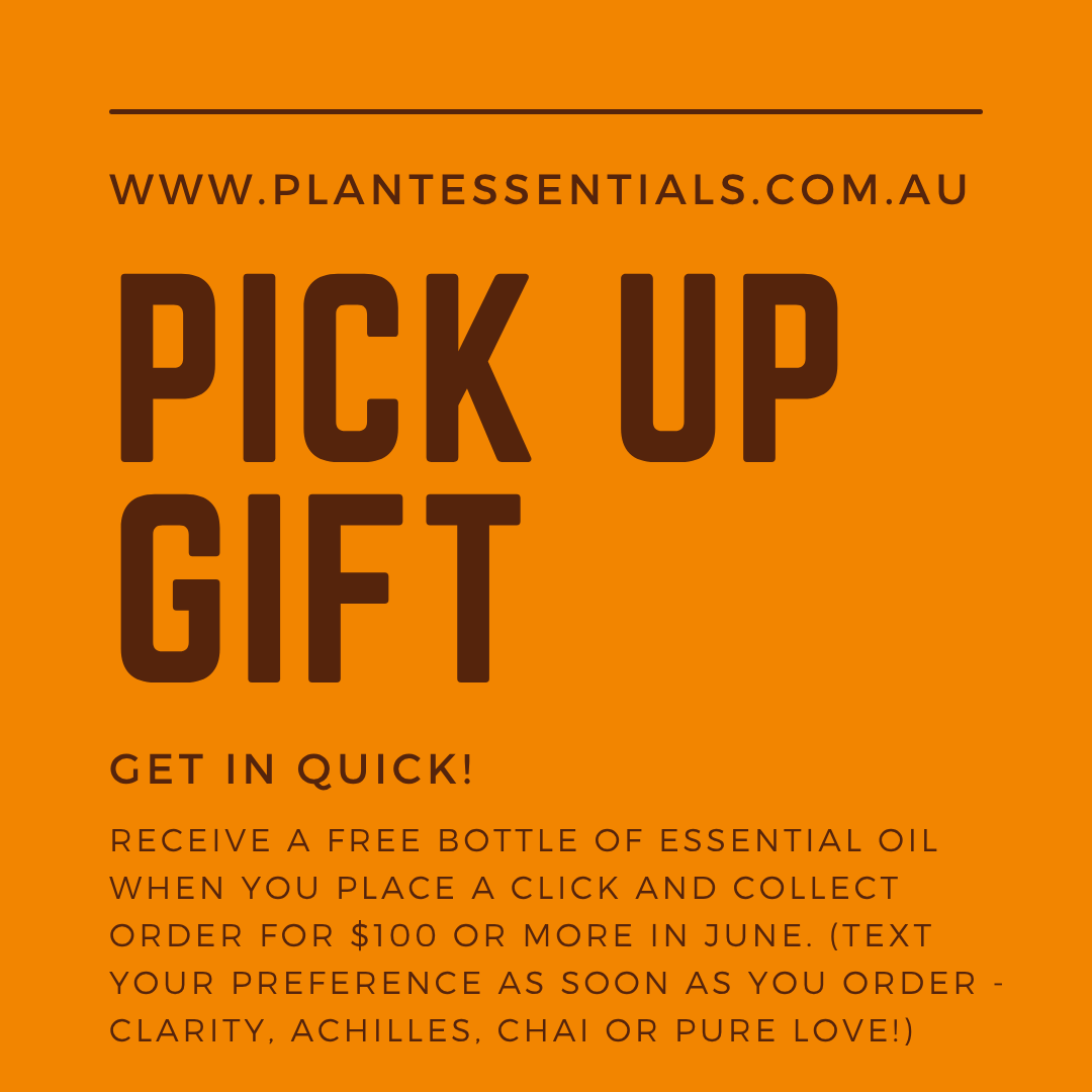 In addition all Click and collect orders valued over $100 place from the time this email goes out for the month of June will receive a free 10ml bottle of either pure love essential oil blend, achilles essential oil blend, clarity essential oil blend or chai essential oil blend (while stocks last) - please text us with your preference after you place your order - if we don't receive a text, we'll make the intuitive choice for you.